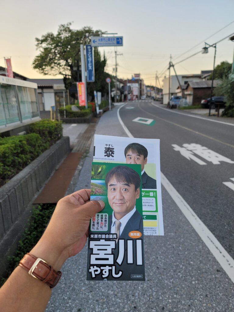 私は後援会リーフレットを配布する際に「残心」をとっています。
